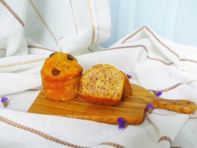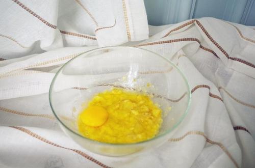 175℃预热烤箱;香蕉用打蛋棒碾碎,别弄得太碎,需要保留一些香蕉的颗粒;接着加入鸡蛋并搅拌均匀;