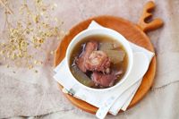 冬瓜100克,鸭1/2只,干荷叶10克,茯苓10克,赤小豆20克,姜2片,