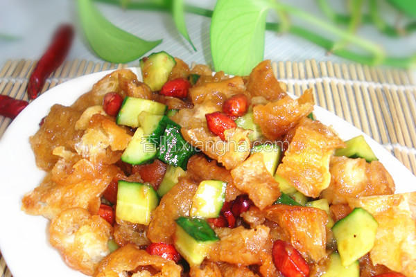 放入少许白糖炒匀,放入黄瓜丁和花生米。