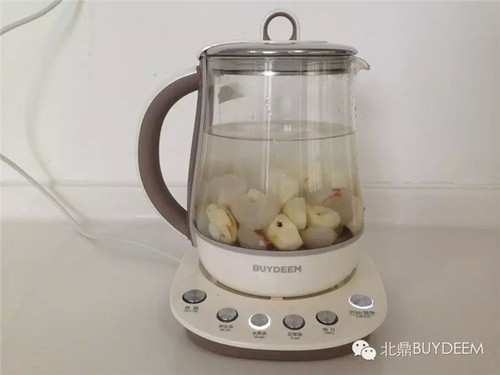 将处理好的食材放入养生壶,加水至1000ML左右,启动水果茶模式。