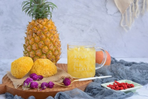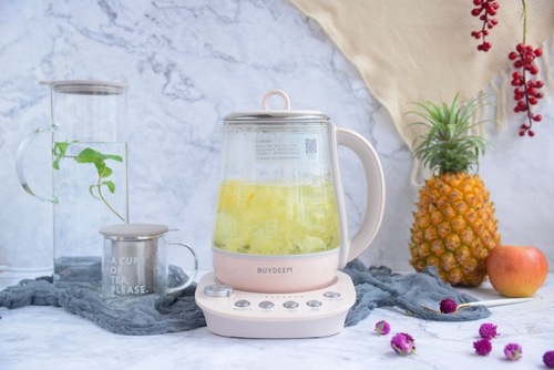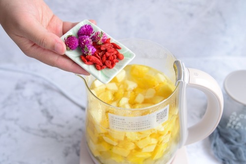待养生壶程序结束后,加入枸杞、千日红、菠萝和苹果,启动水果茶模式。