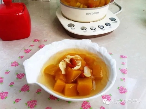 将南瓜去皮去瓤,切成小块,百合、枸杞洗净一起放入养生壶中,加水至1000ML,启动养生汤模式。