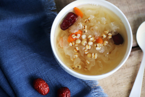 将银耳和皂角米泡置清水中2小时。待银耳泡发后去根蒂,洗净,将银耳撕碎成小朵,放入养生壶。