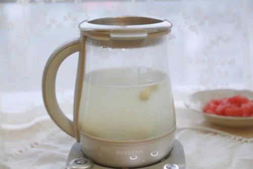 养生壶工作40分钟后,放入冰糖和淀粉,适度搅拌。