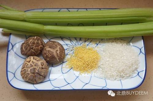 小米 35g、大米 35g、西芹 150g、香菇 3颗、盐 适量