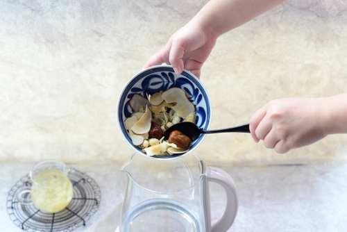 、倒入水至指示线1.5L处,选择滋补汤模式,煮好之后可以根据自己的需要加冰糖。