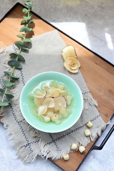 、将泡好的莲子、皂角米、海底椰放入养生壶,放入新鲜百合瓣、切块雪梨、蜜枣。