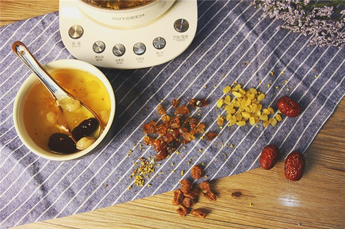 、待自动断电后,加入桂花和40克冰糖,放置10分钟左右即可食用。