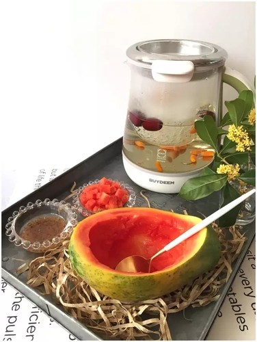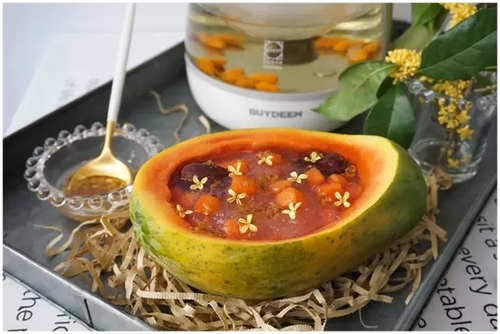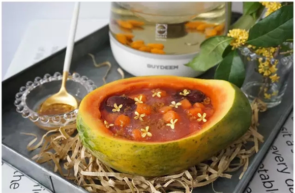 、将燕窝舀入木瓜盅,撒上木瓜丁,倒入养生壶里的红枣枸杞水,舀入适量桂花蜜,即可。