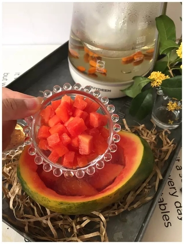 、在等待的过程中准备木瓜盅,在木瓜2/3处切出一个椭圆形弧度。用勺子挖掉木瓜籽和部分果肉,将挖出来的果肉切成小丁备用。