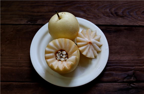 、川贝洗净 、梨切花型挖掉核