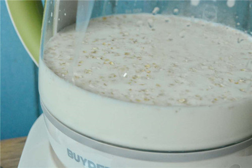 、 壶内加入没过壶底一两厘米的矿泉水,倒入燕麦片用“水果茶”功能加热至微微冒泡