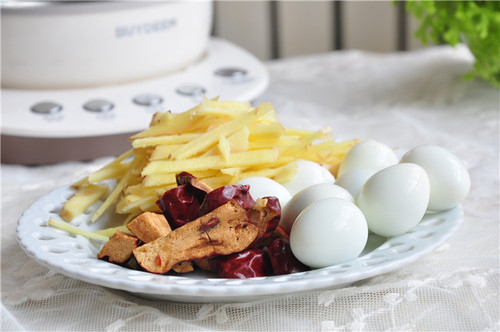 姜切成丝,枣去核剪成细段,熟鹌鹑蛋去壳备用。