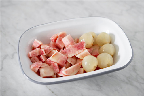 水蜜桃洗净去皮切小块,荔枝剥出果肉。