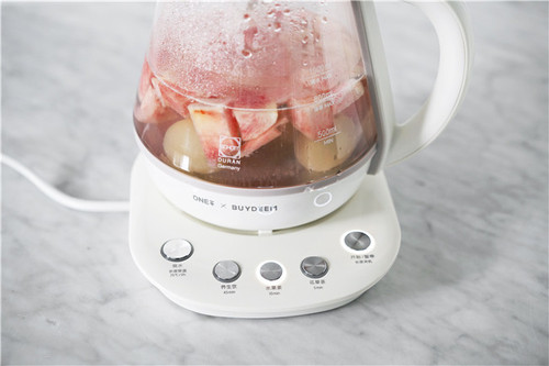 留出一小部分蜜桃块,把剩下的蜜桃块和荔枝果肉放入养生壶,加水至800ml处,按下水果茶程序。