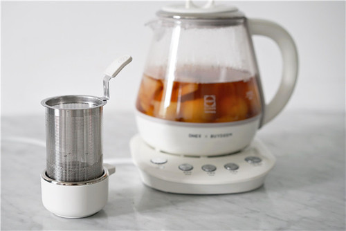 待程序结束断电后,把伯爵茶叶放入过滤茶篮,盖上壶盖,焖泡1-2分钟至茶汤颜色浸出。