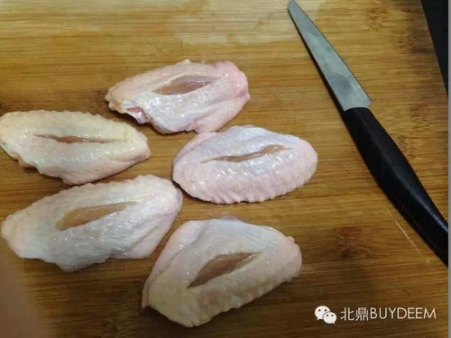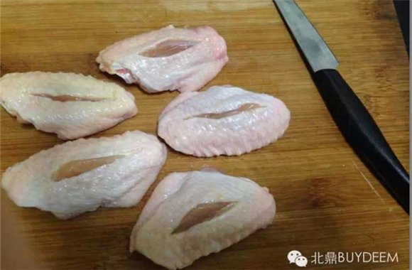 将鸡翅洗净,控水,在鸡翅的两面各划一道。