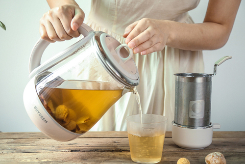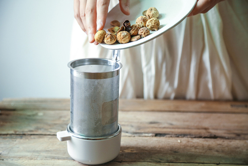 无花果、南杏、陈皮放入大茶篮中,雪梨干、蜜枣、桂圆放入壶内,加水至1200ml,启动养生汤模式。