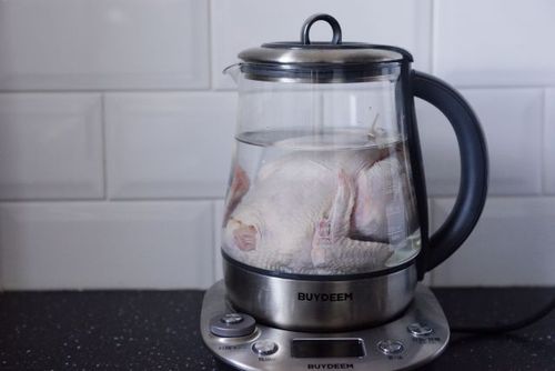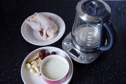 把鸡放入养生壶中,加入没过整只鸡的清水,不要超过1500ml的最大水位线就可以,选择养生汤模式煮60分钟。