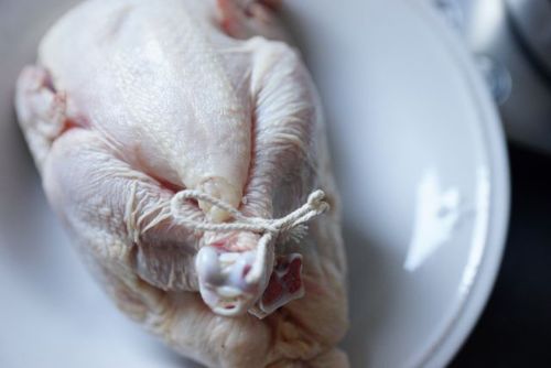 将糯米、红枣、蒜、白参填进鸡肚里,并把鸡腿交叉,用干净的线绳绑紧,这样就可以防止填进肚子里面的食材跑出来。
