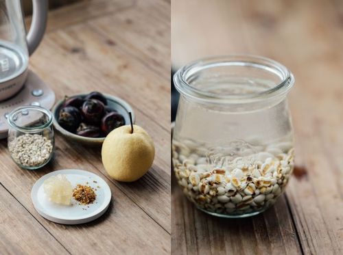 雪梨、马蹄与薏米一起放入养生壶中,加水至1200ml,启动养生汤模式。
