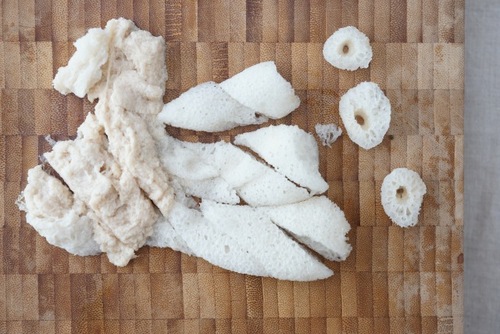 竹荪提前浸泡,用温的淡盐水泡发15分钟,并减去菌盖头(封闭的一端),然后切成小段,待用。