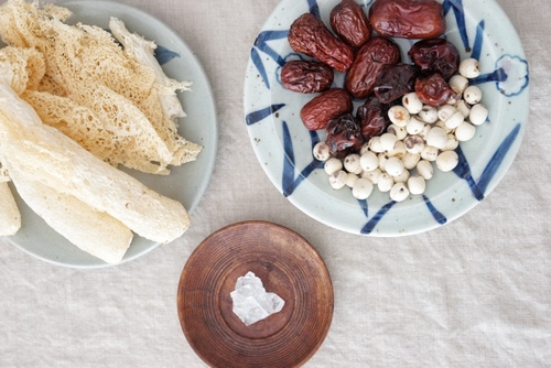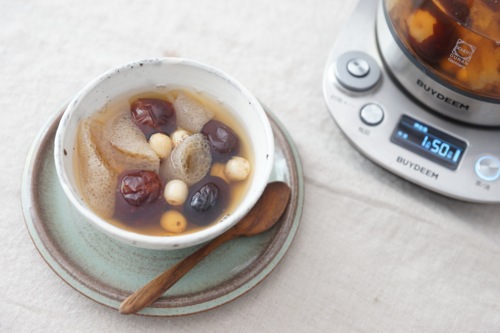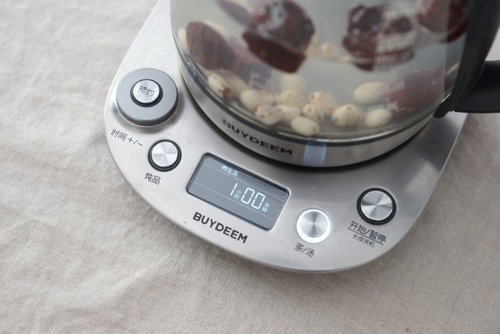 将大枣、蜜枣、莲子一起放进养生壶内,加水至1200mL,选择“养生汤”模式煮1小时。