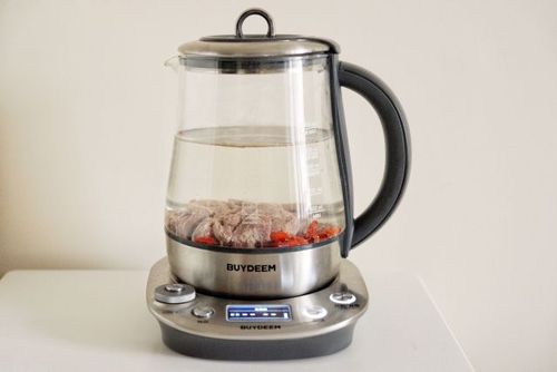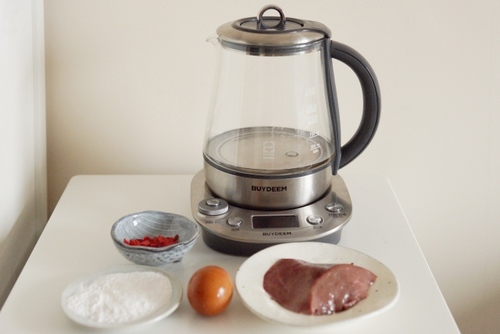养生壶加水至1200mL,选择“花果茶”模式,水煮开后放入枸杞子和腌好的猪肝。