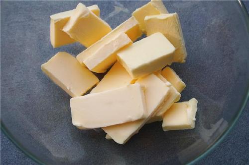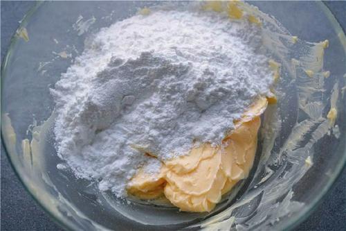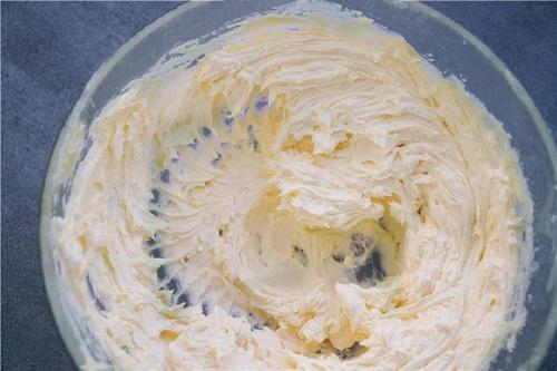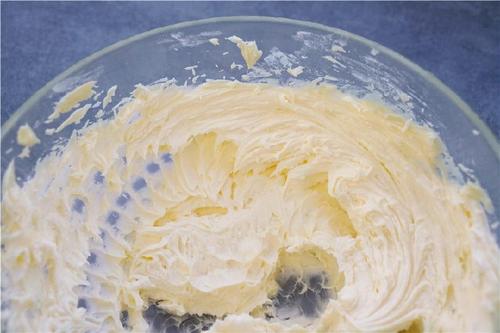 先用刮刀把黄油和糖粉粗略混合(防止打蛋器工作时糖粉飞溅),再接着用电动打蛋器,打发至糖粉融化、黄油发白膨大,边缘呈小羽毛状;