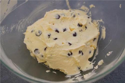 耐高温巧克力豆事先用刀稍稍切碎一些,或直接用迷你巧克力豆,加入到黄油霜中用刮刀轻轻搅拌均匀;