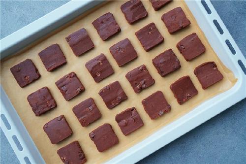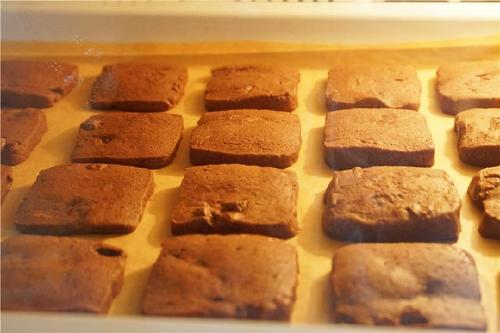 成形的曲奇面团从冰箱中取出,切片。因为加入了一些巧克力豆,肯定会比原味曲奇难切一些,建议在面团还比较硬的时候切,软了再切饼干就会变形,巧克力豆也会在切的过程中全部掉出来;