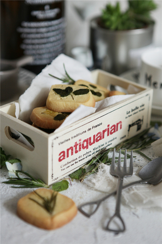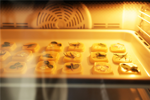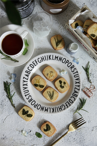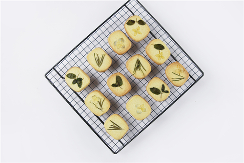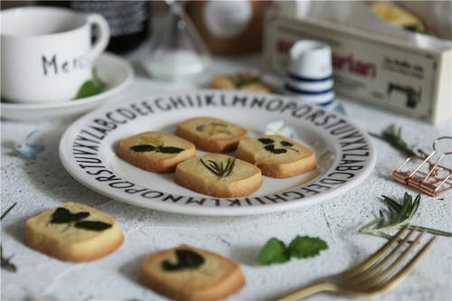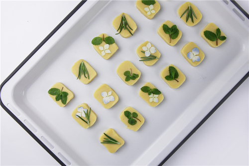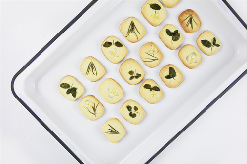 将饼干铺排在烤盘中,留出一些间隙,将植物直接按在饼干表面,动作要轻柔,植物必须贴服,四周不可起翘。(植物洗净,用厨房纸滤干)