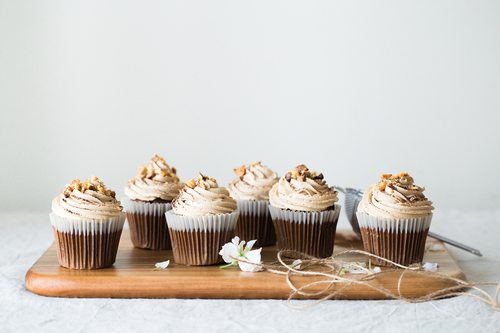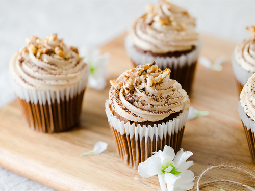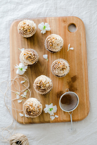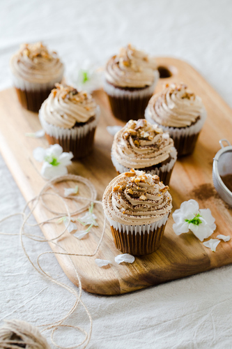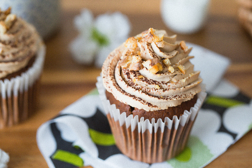 将淡奶油挤在蛋糕顶上,撒上已经放凉的核桃碎,再在另一侧用粉筛筛上可可粉即可;