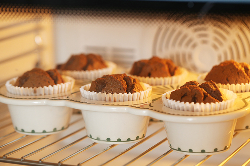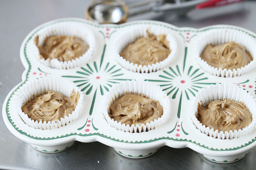 用勺子将蛋糕糊装入模具中,放入预热好的烤箱中层,转180°上下烤18~20分钟;