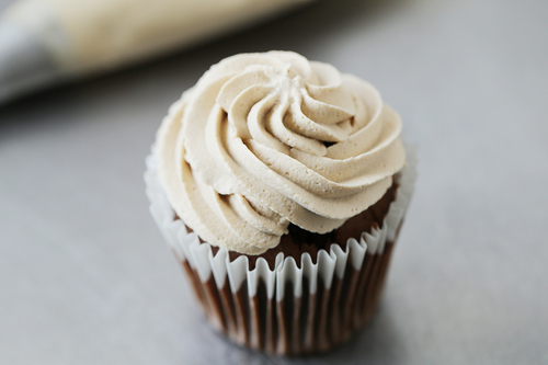 蛋糕放凉后制作咖啡奶油,淡奶油加糖打到出现纹路后,加入之前预留的5g咖啡液和咖啡甜酒打均匀即可,将花嘴装入裱花袋中后再装入打发好的淡奶油;