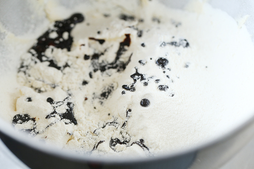 将咖啡液预留5g出来,剩下的和粉类材料分两次加入打发好的黄油中,拌匀;