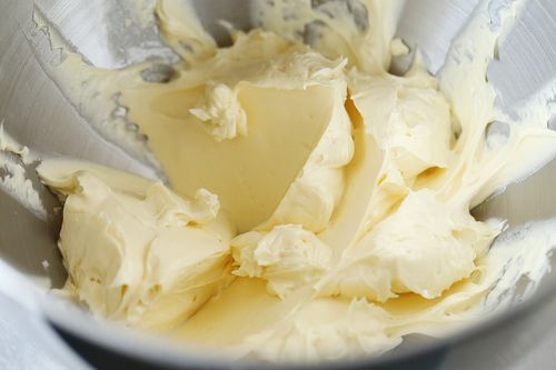 用电动打蛋器或厨师机将黄油打发打到颜色发白的样子,同时预热烤箱190℃;
