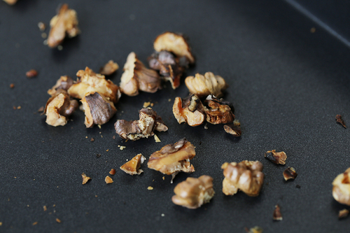 取出蛋糕后,放入核桃仁开始烘烤;同样是180℃,中上层烘烤5-8分钟,烤出香味后取出碾碎成小颗粒装备用;