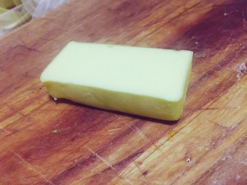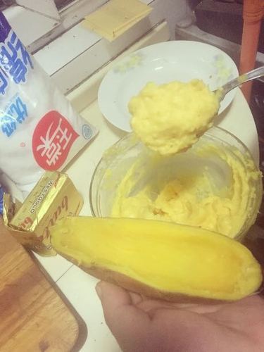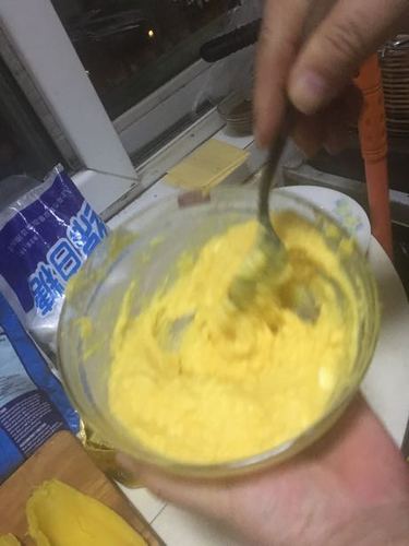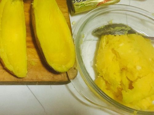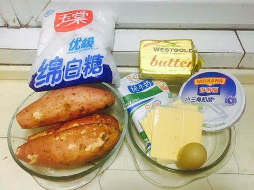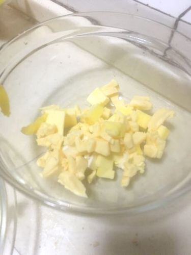 在叮红薯的时候,就可以把黄油、芝士、奶酪切碎备用,加入牛奶、糖备用。