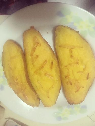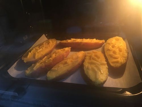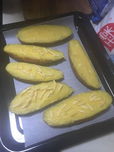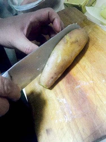 红薯切半,红薯瓤挖出。 注意的是红薯表皮边缘不要挖的太干净,留一点。