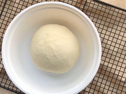 将揉好的面团平均分割成5等份,逐个滚圆,盖保鲜膜松弛10分钟左右,至手指轻按表面基本不回弹的状态。