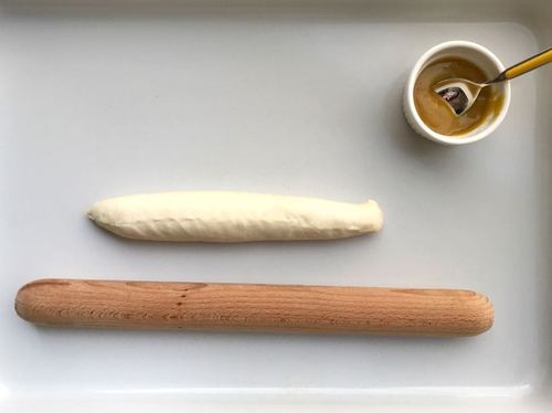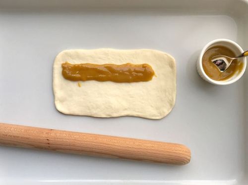 松弛好的面团收口朝上,用擀面杖擀成长椭圆形,然后将靠自己方向的长边压平,在另一端抹上蜂蜜芥末酱。注意等会儿要擀平接头的一端留出部分不要抹酱。