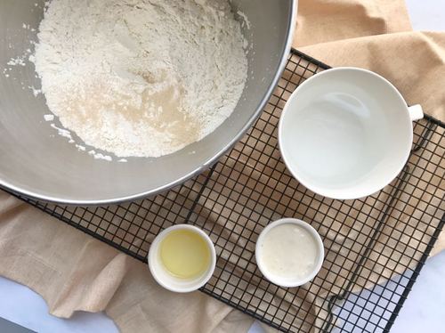将高筋面粉、白砂糖、盐和低糖油酵母混合均匀,然后加入水、液种和植物油,基本混合成团。注意加水量要看着面粉的吸水性来,一但成团就行,不一定要加完。贝果本身是比较硬的面团,别和得太稀软了。