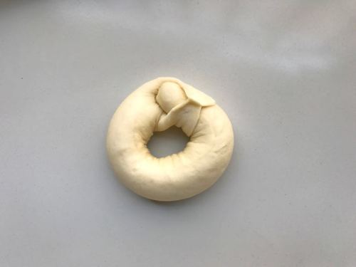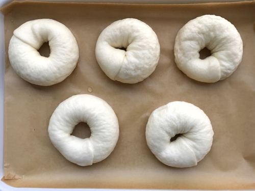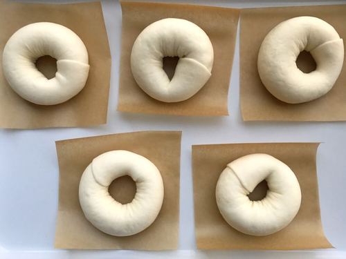 所有贝果都同样整形整形完毕,接缝朝下放置在小片油纸上,35度二发25~30分钟,至面团发酵约2倍大