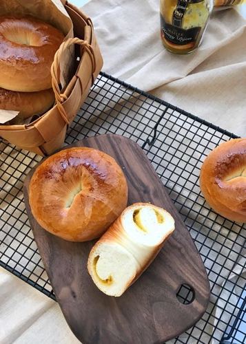 烤好的贝果在晾网上晾凉,就可以开吃啦!这个快手版本只做了一次发酵,烫面时间也减半,但丝毫不影响表面出脆皮,内心也松软喷香!