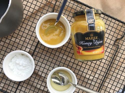 然后准备蜂蜜芥末酱:我用的是这个蜂蜜黄芥末酱,另外又加了点蜂蜜搅匀,筛入淀粉搅拌后,小火加热到酱汁变稠,放凉备用。