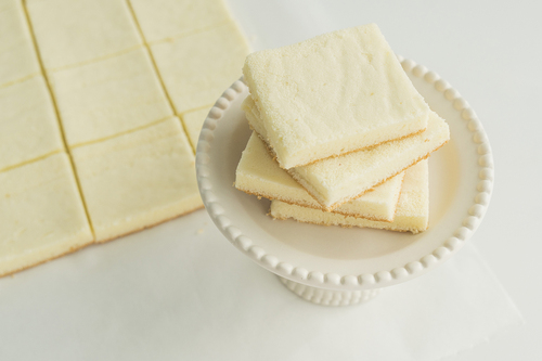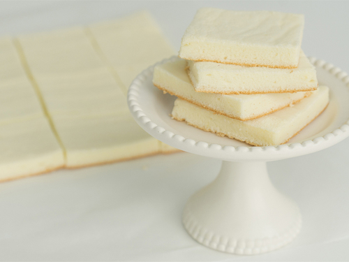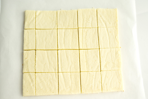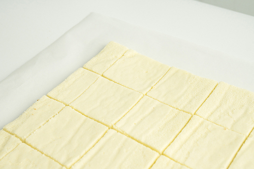 晾好之后就可以切分啦!把蛋糕卷四边先切掉,再进行小块的切分。切之前可以先用锯齿刀压出印子,看看大小是不是合适,看准之后再下刀哦;可以切出16份还有多,大家可以参考图里的大小;这个蛋糕片的大小是基于我们使用的模具去准备的,大家切分时也要根据自己使用的模具大小去切;