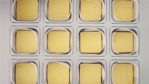 最后,把切分好的小蛋糕片一个个平铺在模具内部就可以了!!如果当天不用,记得要密封冷冻,是冷冻哦!下次要使用时,直接拿出来解冻,再拆开密封使用就行啦!