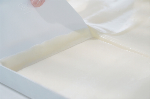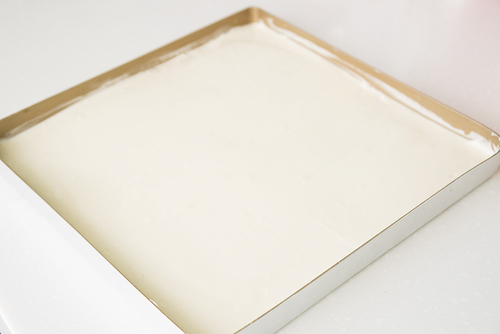 拿出铺好油纸的金盘,将面糊从距离金盆至少25cm高度倒下,这样做也是为了去掉面糊中过大的气泡;用刮板将面糊往四角推开,再贴面刮平;接着在台面上磕两下烤盘,把大的气泡震出,但力度不宜过大,否则会让面糊过度消泡;最后铺好的面糊在烤盘中大概是在图中的这个高度,已经足够了哦;因为是拿来做半熟芝士蛋糕底的,不需要很厚;