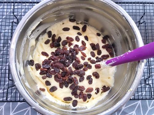 将葡萄干在少量grappa里泡湿(不用泡得很透,就有点酒味就好),然后加入面糊里轻轻拌匀。